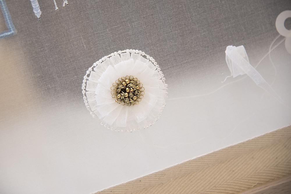 柴田からアドバイスをもらってできた刺繍サンプルを片手に